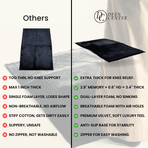 Discover the difference in every prayer. Unlike ordinary mats that wear out, slip, and strain your knees, ours is engineered for comfort and durability — with dual-layer breathable foam, premium velvet, and an anti-slip base. Extra thick cushioning relieves pressure, while the washable cover keeps it fresh for years to come. This is more than a mat — it’s support you can feel in every sujood.